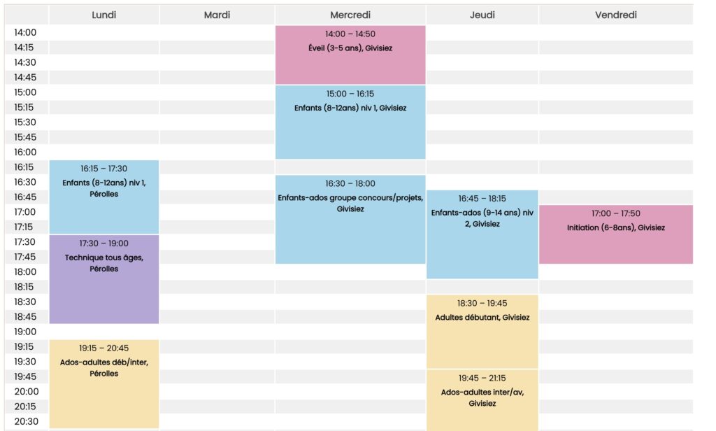 Cours d’essai gratuit mais inscription obligatoire ! NOUVEL HORAIRE 2026-27 (-> horaire actuel 25-26 : voir plus bas)